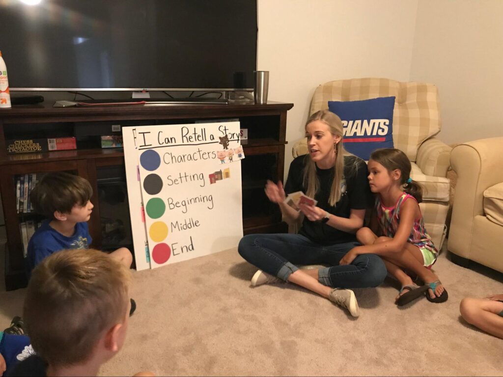 - Story Elements: Discuss the parts of a story and practice retelling it, including characters, setting, beginning, middle, and end.